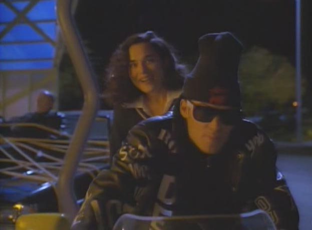 So, the audience is familiar with our main hero. He’s fashionable. His songs are wicked. He owns the world. He owns fluro motorcycles that he has bought his entourage. In a scene that resembles Top Gun and Hot Shots, a blessed countryside bike ride turns into an ego stroke when he sees a cute horse rider Kathy, training her horse. So naturally, out to impress, he jumps his bike over the fence, nearly hitting the horse, but sending Kathy tit-over-arse. Obviously not impressed, Ice drives off to his destination – a colourful painted house that looks like a kiddie offender would try and seduce in wrongful ways.