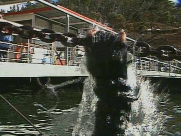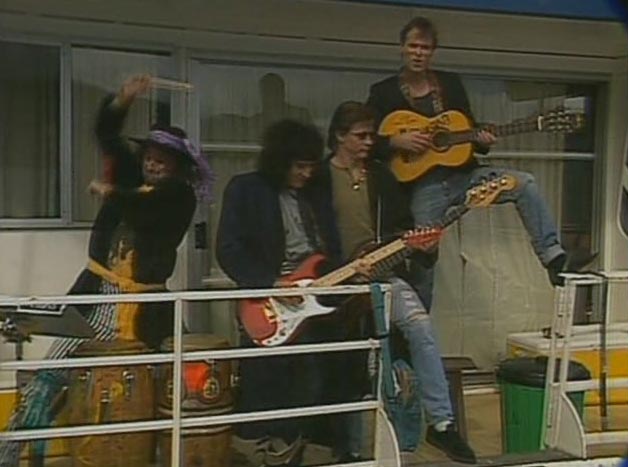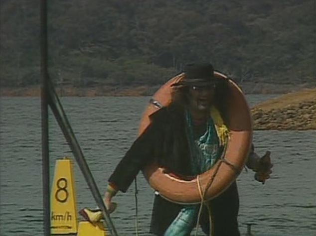 Grant and his wife turn up at one of the houseboats that will be used. More crew turn up, and Gavin Wood looks through his binoculars, from one of the houseboats. The killer’s legs appear again, hovering around the four wheel drive cars, with suspenseful music. Later on, Hey Hey It’s Saturday‘s drummer Animal makes his appearance as the drummer of the band, piss-farting about. Good ol’ 80s. Then there’s about 5 – 10 minutes of the film and video crew settling in for what will be a long week of partying and filming.