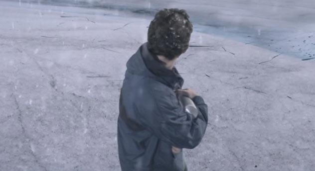Clean, fresh air, crisp, clean water, and a shit-load of ice. Unfortunately, with a peaceful, untouched area, comes disaster from global warming. The earth is heating up, and it decides to go whoop-ass on Greenland’s icebergs. A solo surfer in the water is catching waves from bits of icebergs breaking away. Just as he’s getting a kick out of it, a second, larger piece of ice breaks away, causing a massive wave, engulfing him. That’ll teach him.