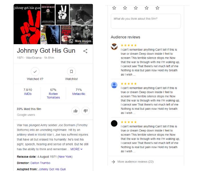 So iconic is the song and the strong association with Johnny Got His Gun, if you are trying to watch the movie solely on its own to kill the curiosity, you naturally would read the reviews made by the general public. In this case, the general public happens to be Metallica fans. Straight from Google Movies, keen film reviewers have been writing their thoughts in the form of word-for-word One lyrics.